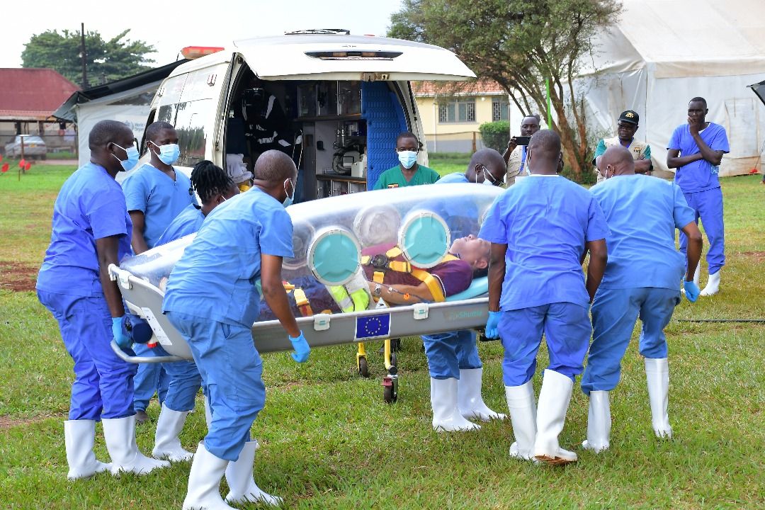A critical component of the simulation was testing the international medical evacuation protocol, coordinated by WHO teams in Uganda, the African Region, and Geneva. The Uganda Police Air Wing supported the air evacuation using an epishuttle device.