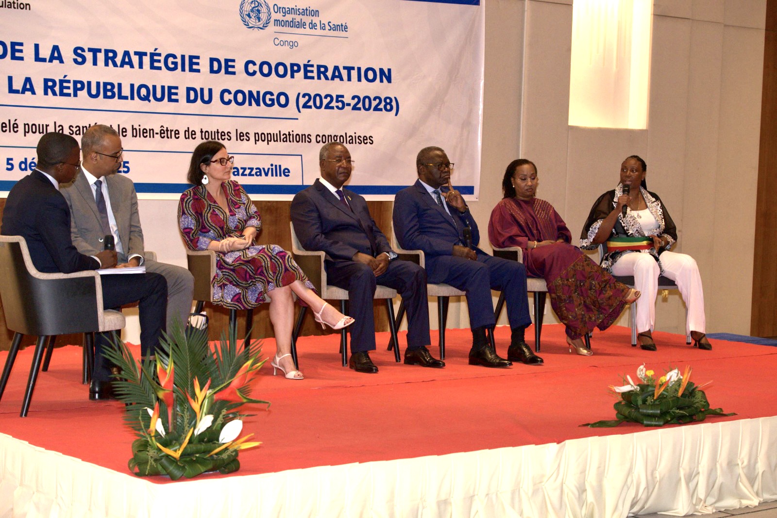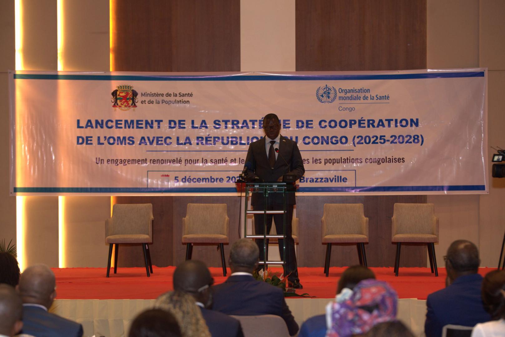Brazzaville, 5 décembre 2025 - La Stratégie de Coopération pays (SCP) 2025–2028 entre l’Organisation mondiale de la Santé (OMS) et le Gouvernement du Congo a été lancée officiellement ce 5 décembre 2025 au Grand Hotel de Kintele. Placée sous le haut patronage Ministre de la Santé et de la Population, le Professeur Jean-Rosaire Ibara, cette cérémonie a connu la participation du Ministre de la Défense nationale, M. Charles Richard Mondjo, du Représentant Résident de l’OMS au Congo, Dr Vincent Dossou Sodjinou, de la Représentante du Coordonnateur résident du Système des Nations Unies, des chefs d’agences onusiennes, du corps diplomatique, des partenaires techniques et financiers, des chefs d’entreprises, des représentants de la société civile et des médias. Trois temps forts ont meublé cette séance : la cérémonie d’ouverture, la présentation du processus d’élaboration et des priorités stratégique retenues, des panels de discussion sur la mise en œuvre de la stratégie et la signature d’une pancarte d’engagement des acteurs à appuyer la mise en œuvre de la stratégie.