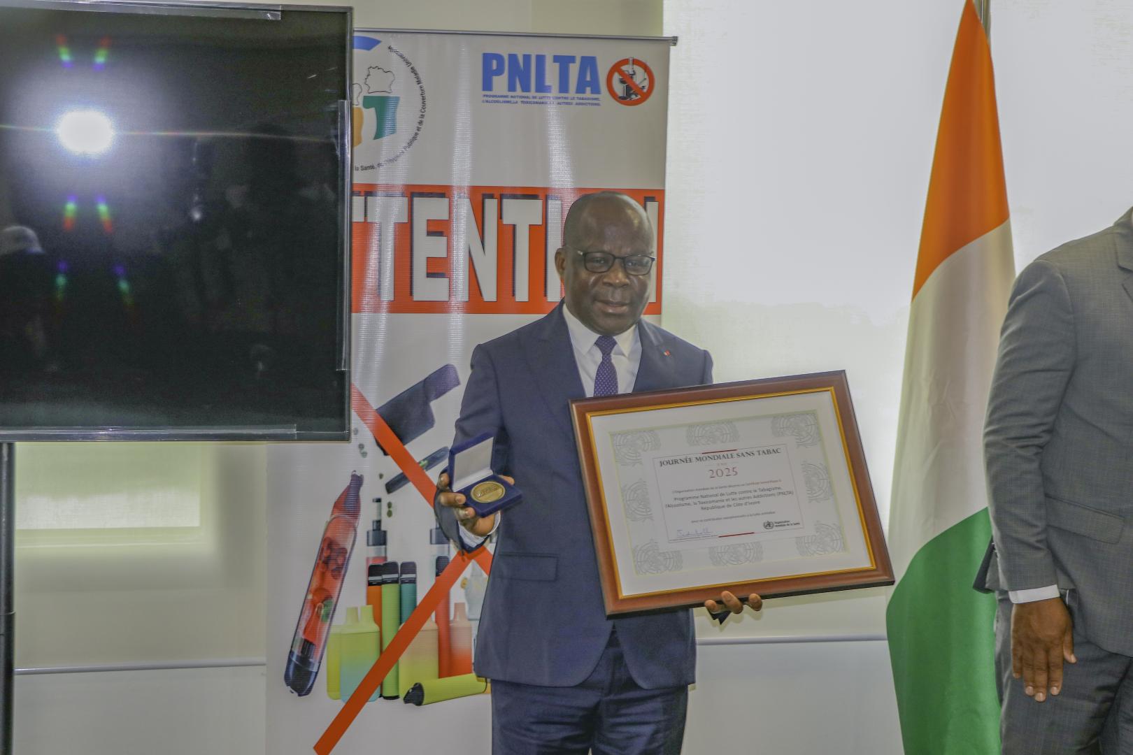 Le Prix spécial du Directeur Général de l’OMS a été décerné au Programme national de lutte contre le tabagisme, l’alcoolisme et la toxicomanie (PNLTA) ainsi qu’au Club ivoirien de lutte contre le tabagisme, l’avortement et le Sida en milieu scolaire (CILTAS), une ONG de la société civile.