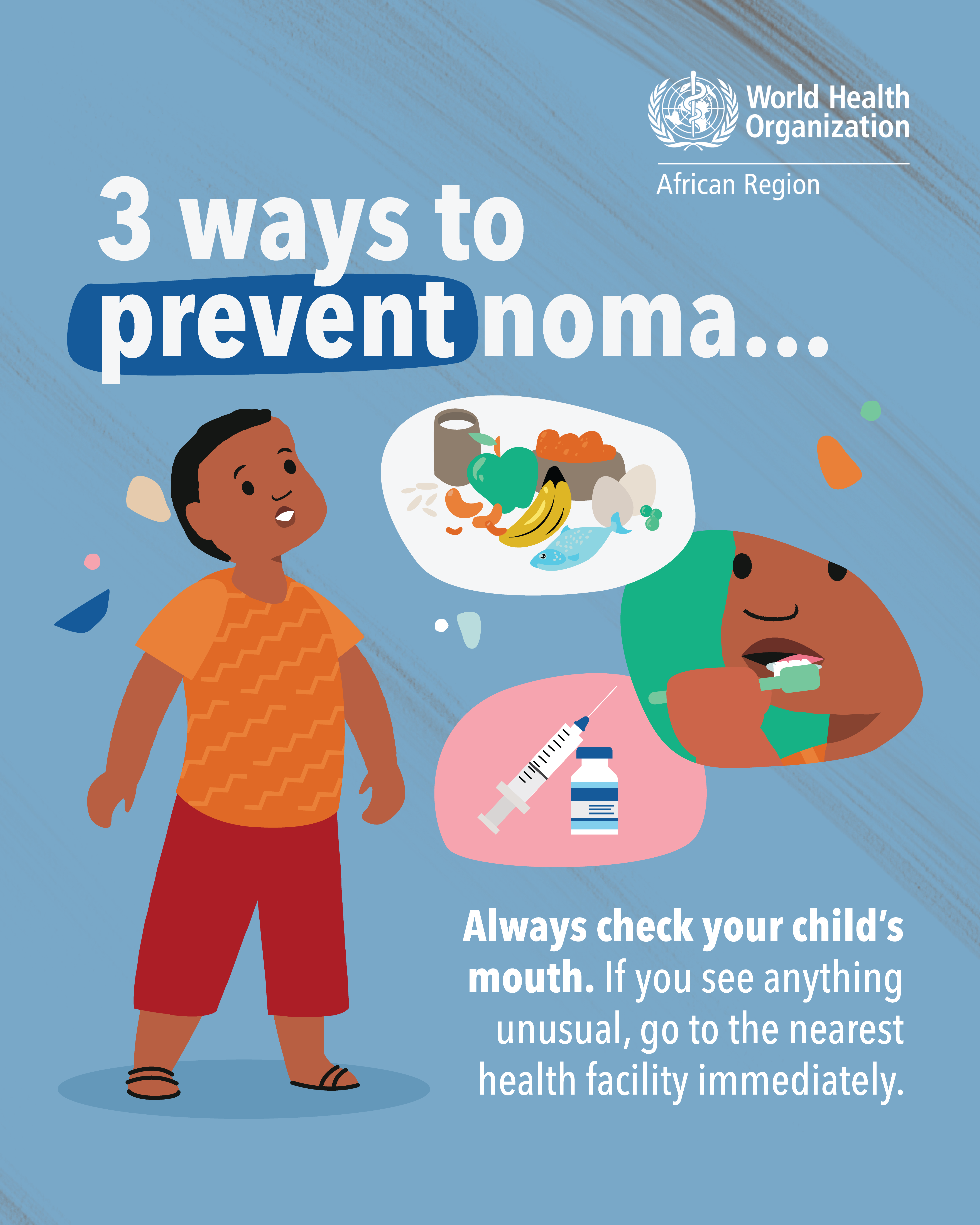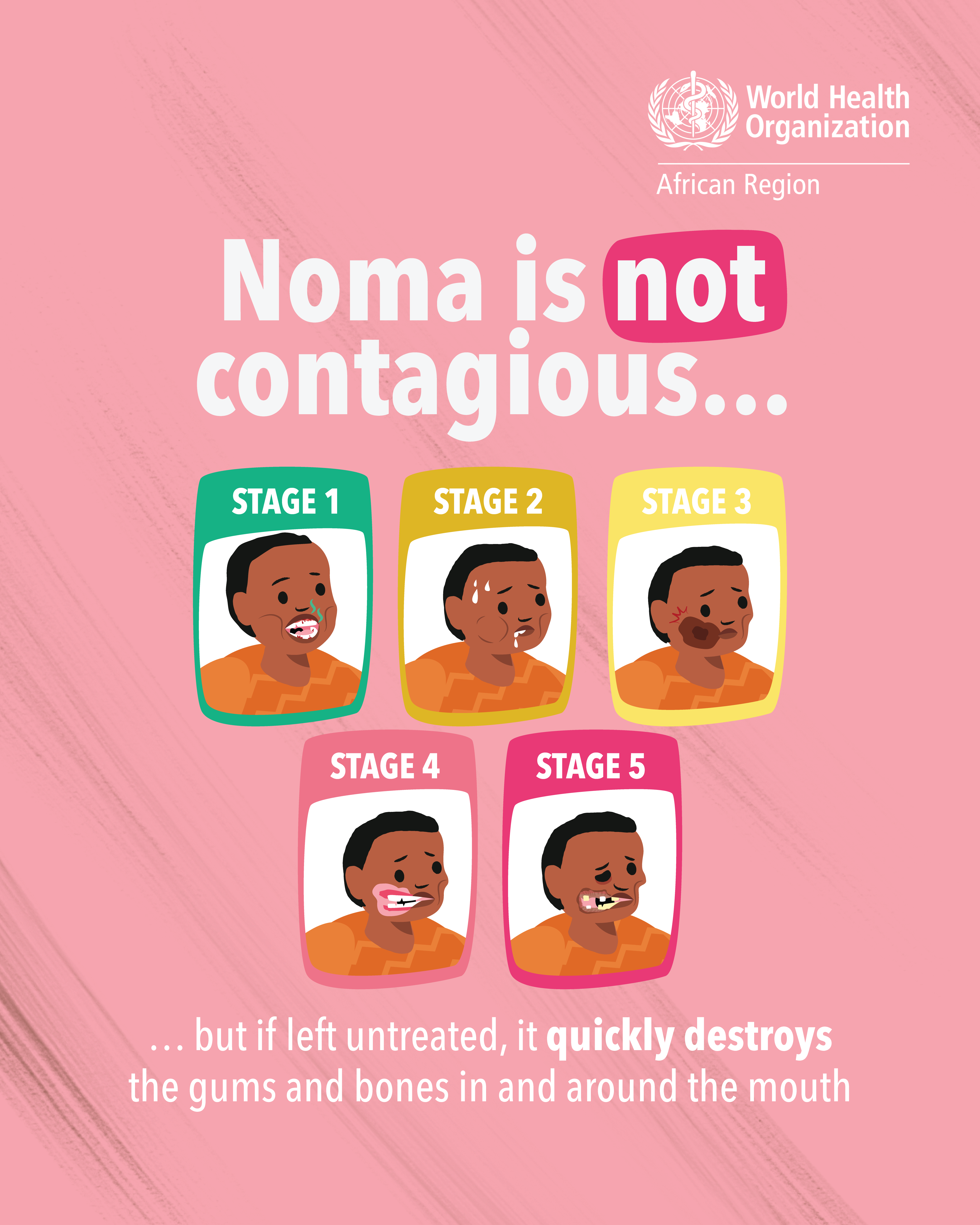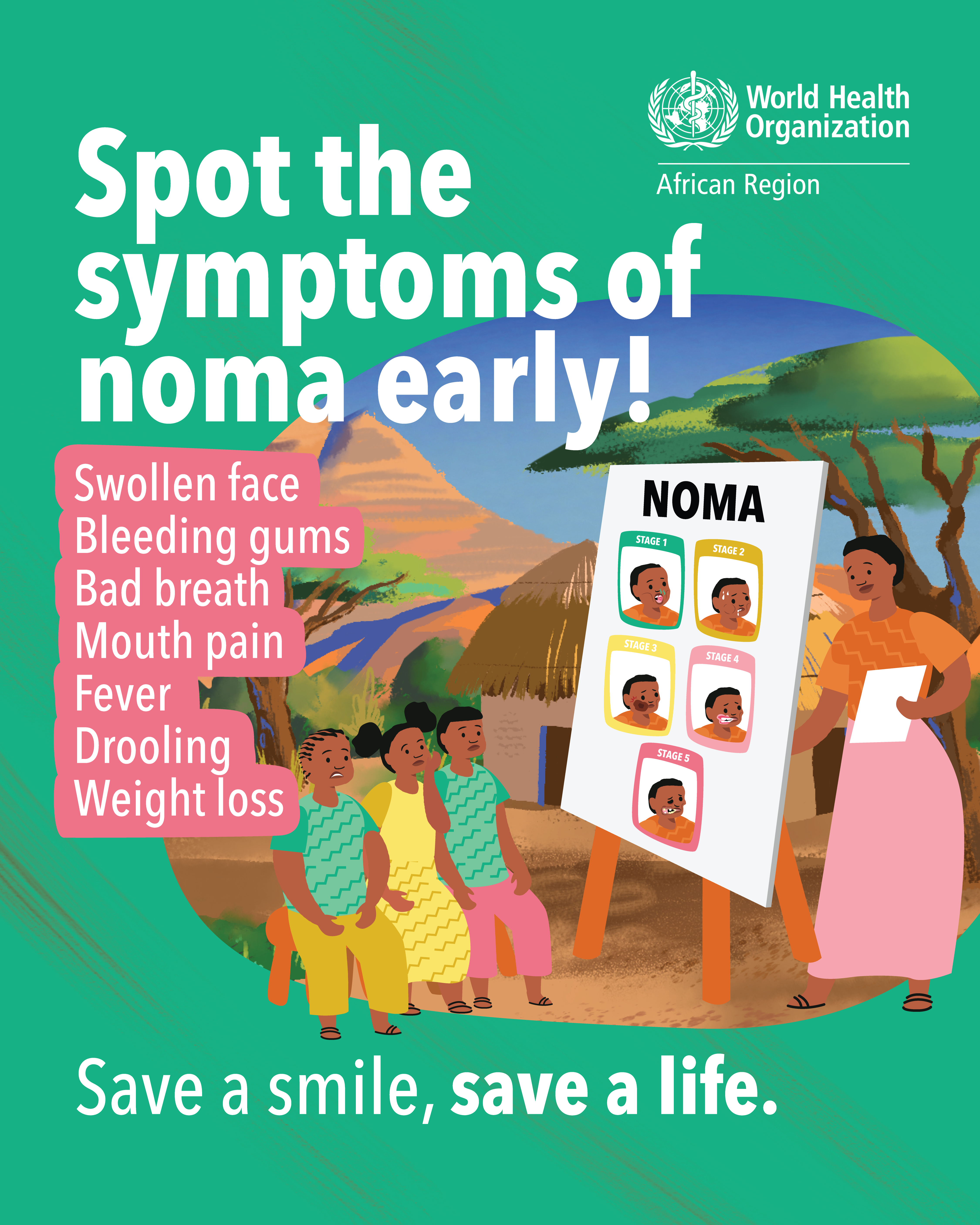 In 1998, WHO estimated that there were 140 000 new cases of noma annually. However, due to the lack of robust estimate and systematic reporting, the true global burden of noma and its distribution have been difficult to plot accurately. Without treatment, noma is fatal in 70 to 90% of cases. Where noma is detected at an early stage, its progression can be rapidly halted, through basic hygiene, antibiotics, and nutritional rehabilitation. Such early detection helps to prevent suffering, disability, and death. However, the great majority of affected communities in Africa are situated in peri-urban and rural areas where traditional beliefs and stigma are prevalent, and early detection, diagnosis and access to care are difficult. Survivors suffer from severe facial disfigurement, have difficulty speaking and eating, face social stigma, and require complex surgery and rehabilitation.