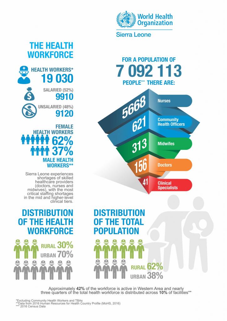 The WHO is contributing to efforts in strengthening the Sierra Leonean health system by supporting the Ministry of Health and Sanitation (MoHS) in areas such as health workforce planning and management, health information systems, policy and planning, district and hospital management and health financing.