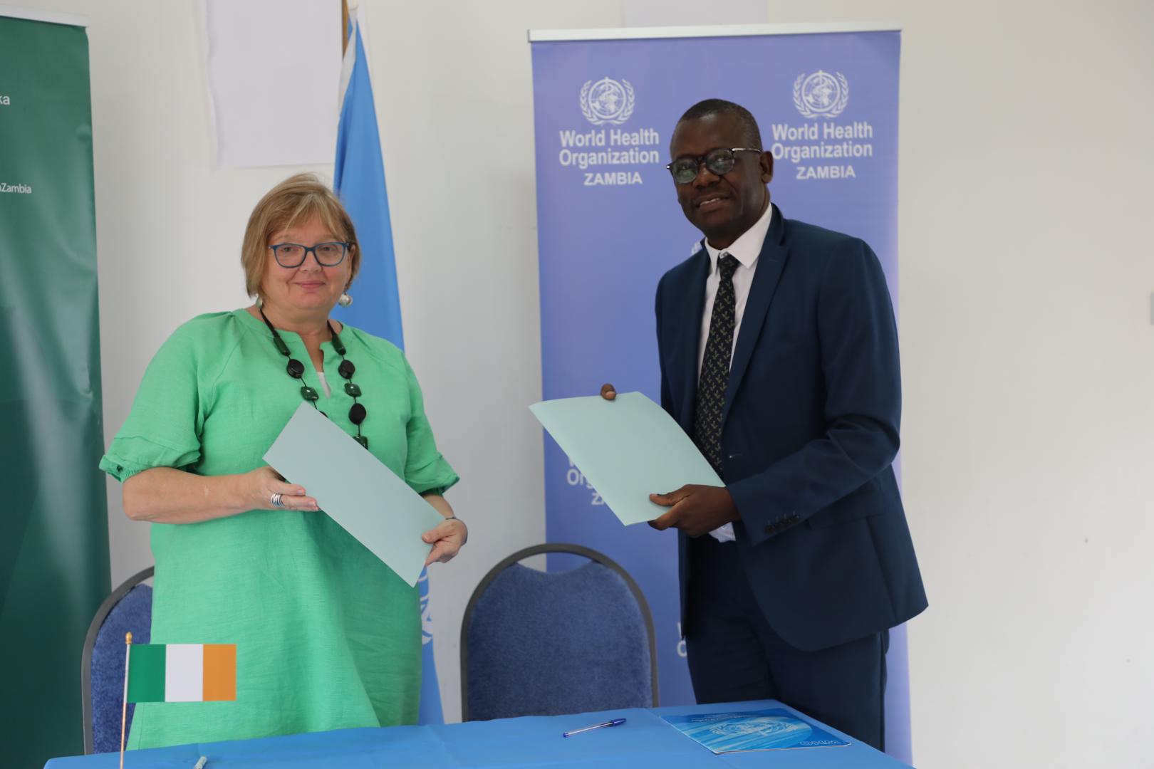 Lusaka - Today, HE Ambassador of Ireland to Zambia, Ms Bronagh Carr and WHO Country Representative, Dr Nathan Bakyaita signed an agreement confirming €500,000 in funding from Irish Aid to WHO Zambia for the national capacity for emergency preparedness, response, recovery, and health surveillance systems project.