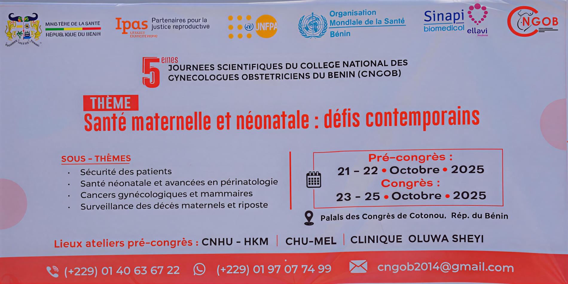 Du 23 au 25 octobre 2025, le Palais des congrès de Cotonou a accueilli la 5ᵉ édition des Journées scientifiques du Collège national des gynécologues et obstétriciens du Bénin (CNGOB). Trois jours de réflexions, d’ateliers cliniques, de communications scientifiques et de plaidoyer consacrés à un enjeu majeur : l’avenir de la santé maternelle et néonatale au Bénin et en Afrique.