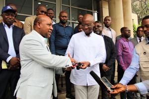 KINSHASA, 23 août 2023. Le ministère de santé de la RDC et l’Organisation mondiale de la santé (OMS) renforcent depuis mars 2023, les capacités d’une équipe multidisciplinaire et multisectorielle de 213 personnels de santé pour intervenir rapidement dans les situations d'urgence. Un lot de huit véhicules de terrain a été remis par le Dr Boureima Hama Sambo, Représentant de l’OMS en République démocratique du Congo, au Ministère de la Santé Publique, Hygiène et Prévention pour soutenir les activités de l’initiative de préparation et de réponse aux urgences (SURGE).