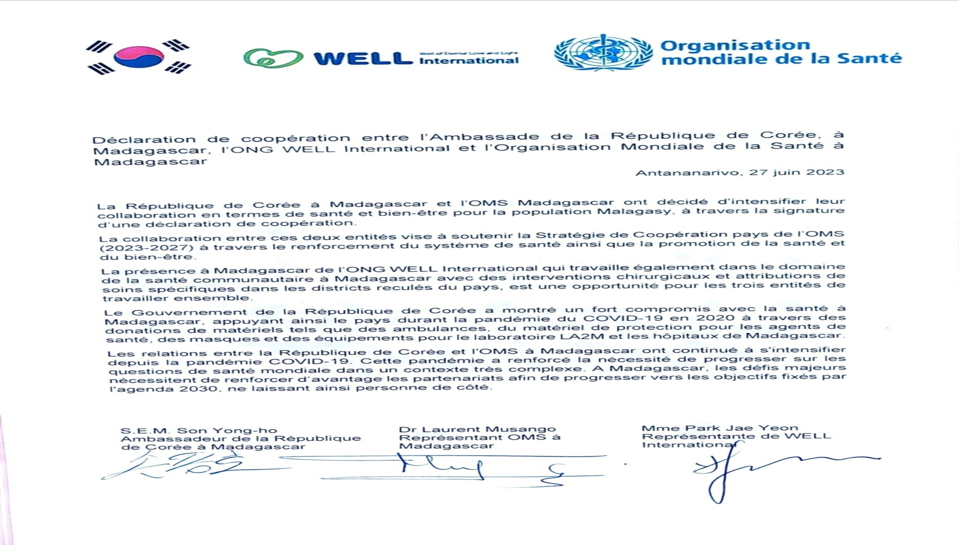 L’Ambassade de la République de Corée à Madagascar, WELL International et l’OMS Madagascar signent ce jour, une déclaration de coopération en vue de soutenir la Stratégie de coopération pays de l’OMS (2023-2027) à travers le renforcement du système de santé ainsi que la promotion de la santé et du bien-être. L’ambassadeur de la République de Corée à Madagascar S.E.M. Yong-ho Son et le Représentant de l’OMS à Madagascar, le Dr Laurent Musango ont échangé par rapport aux besoins et aux priorités existant à Madagascar en termes de santé et sur la nécessité d’accélérer les progrès vers l’atteinte des objectifs de développement durable d’ici 2030.