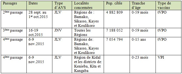 Lors du 4ème passage, le VPI sera conjointement administré avec le VPO trivalent aux enfants âgés de 0 à 23 mois de la Région de Kidal et des aires frontalières avec la Guinée des districts de Kenieba, Kita et Kangaba.