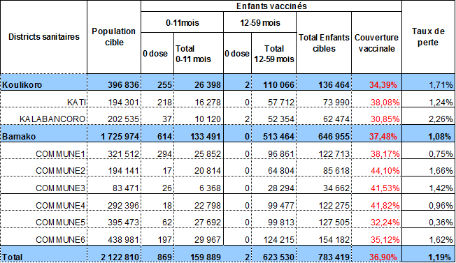 Malgré le caractère urgent de la situation, les 6 communes du District de Bamako ont pu s’organiser pour élaborer des micros plans en s’inspirant de ceux élaborés lors des JNV polio antérieurs. Au niveau de chacune de ces communes, le comité de coordination existant, a été mis à profit dans la gestion de cette épidémie.
