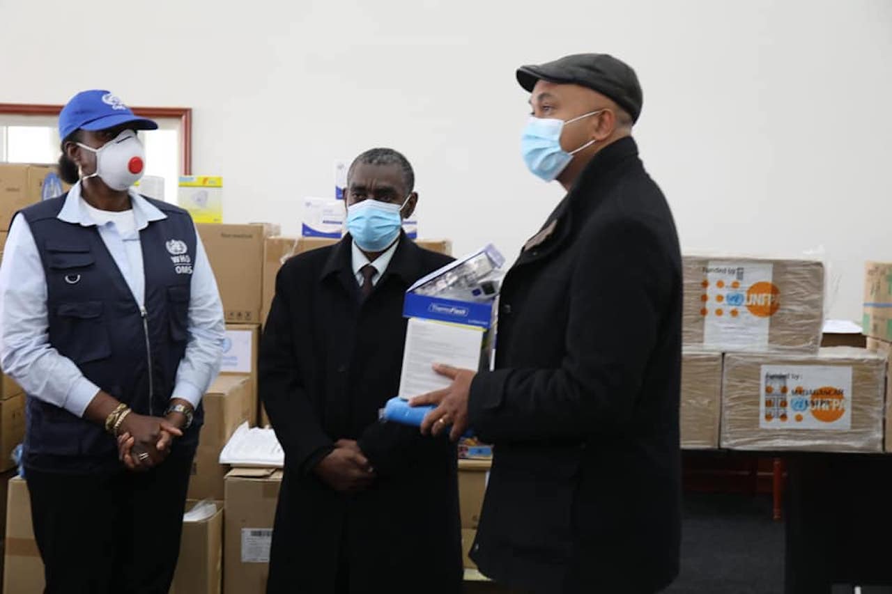 Ainsi, pour répondre aux besoins urgents pour une prise en charge adéquate des cas confirmés dans les formations sanitaires, ainsi que pour la continuité des services essentiels dans les structures de santé, maternités et centres de référence obstétricale, l'Organisation Mondiale de la Santé (OMS) apporte son soutien et a mobilisé les autres agences du Système des Nations Unies (UNFPA, PNUD, et PAM) ainsi que la   Croix Rouge Malagasy (CRM).  Des dons d’équipements de protection individuelle et des médicaments, d'une valeur estimée à plus de 724 000 USD soit plus de 2 751 200 000 MGA, dont 500 000 USD par l’OMS et 224 000 USD par l’UNFPA ont été remis au Ministère de la Santé Publique. La cérémonie de remise officielle a eu lieu ce mardi 4 août 2020 au CCI Ivato, en la présence du Ministre de l’Intérieur, Monsieur Tianarivelo RAZAFIMAHEFA, du Ministre de la Santé Publique, Pr Ahmad AHMAD et de la Représentante Résidente de l’OMS à Madagascar et Coordinatrice résidente a.i. du Système des Nations Unies (SNU), Pr Charlotte Faty NDIAYE.