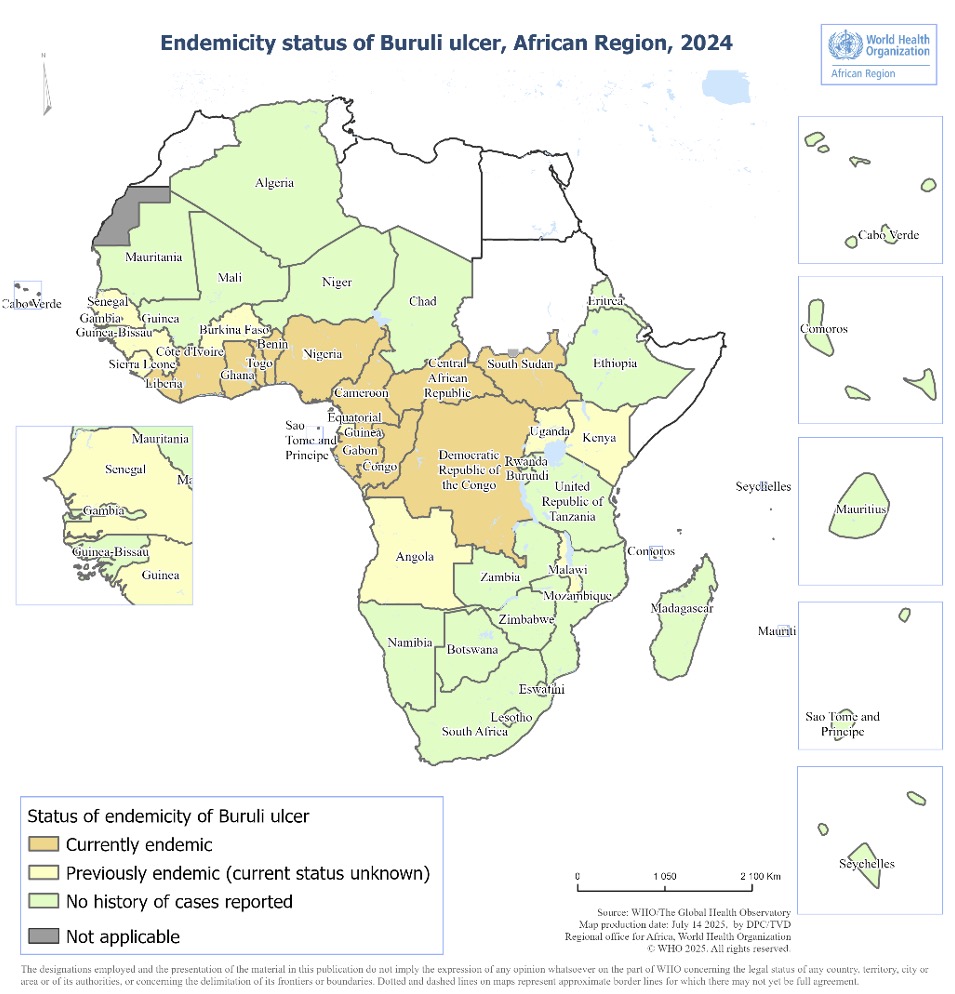 Figure 1. Status of endemicity of Buruli ulcer in the African Region, 2024 .