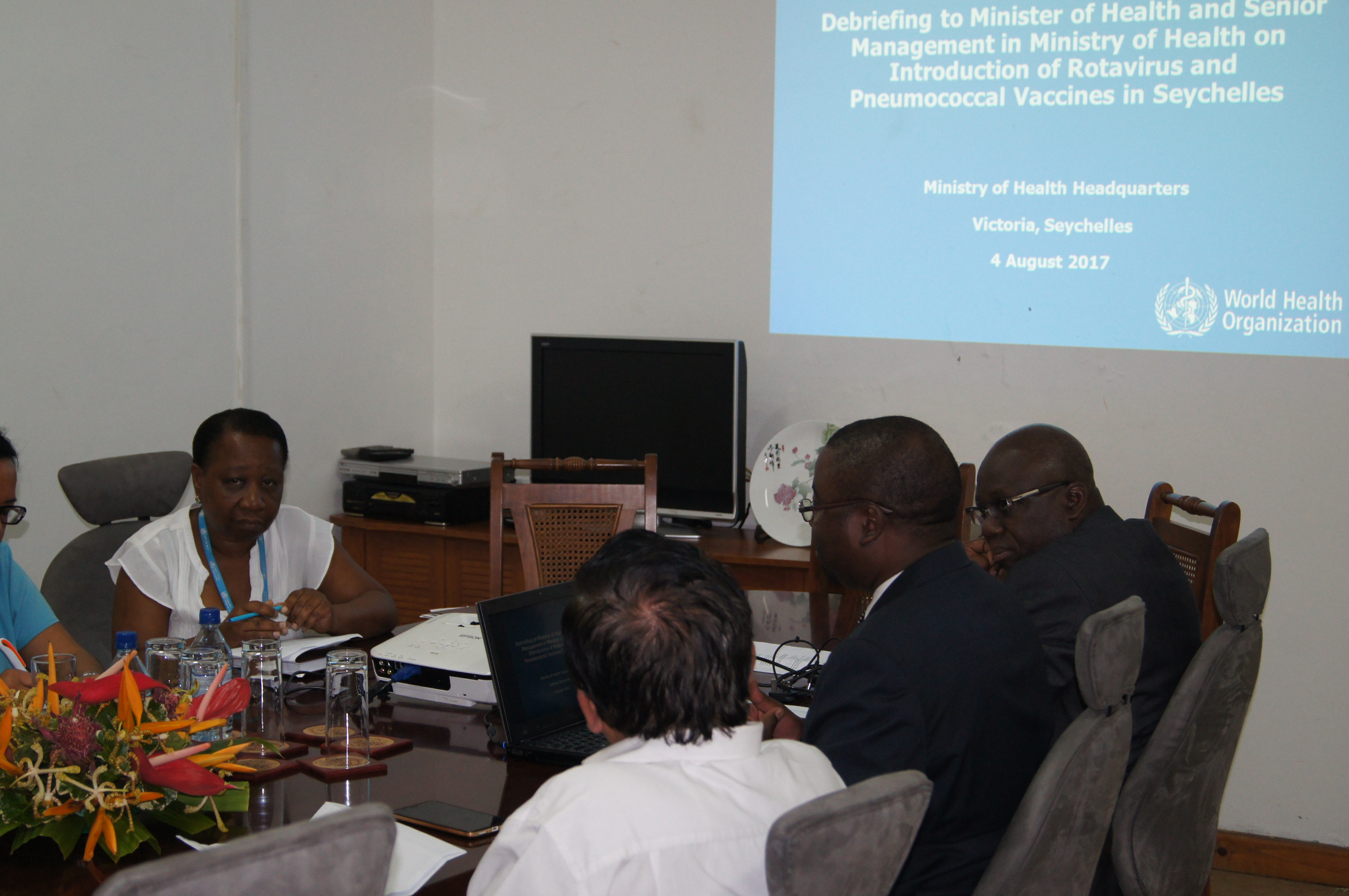 Victoria, Seychelles, 9th August 2017 - The Seychelles is well on track with the preparation to introduce two new vaccines into its routine immunisation programme. This was confirmed by the two WHO Consultants who were in the country between the 24th July and 4th August 2017 to assess the country’s readiness to introduce the Rotavirus vaccine and the Pneumococcal Conjugate vaccine (PCV). WHO Consultants Dr. Mumba Mutale and Dr. Amos Petu presented their findings of their assessment at a debriefing session with the Minister of Health Jean-Paul Adam, other high level officials of the Ministry of Health and the WHO Liaison Officer for Seychelles Dr. Bhupinder Aulakh.