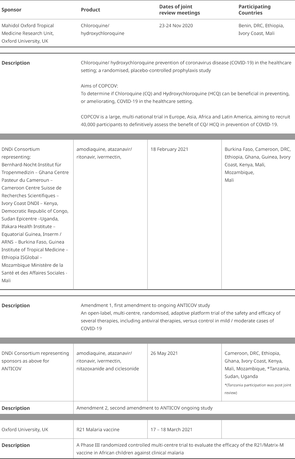 - AVAREF Emergency Joint Review meeting for DNDi ANTICOV 1st Amendment of the approved clinical trial for COVID-19 therapeutics in African countries (18 February 2021, Virtual Meeting)