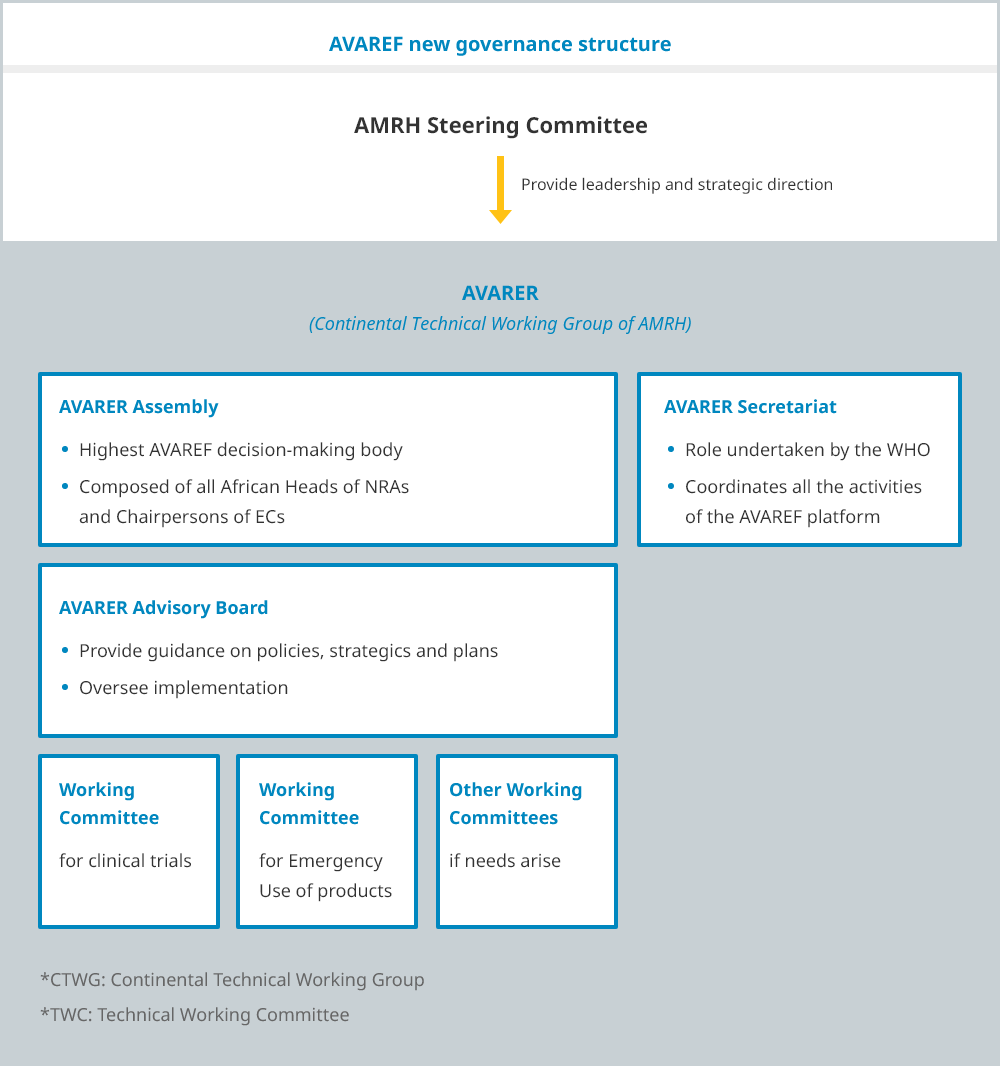 In 2019, the AVAREF Assembly adopted a new governance structure to align with the African Medicines Regulatory Harmonization (AMRH) Initiative. This new structure transformed AVAREF’s Technical Coordination Committee into a Continental Working Group, and the AVAREF Steering Committee was re-established as an Advisory Committee to provide strategic guidance for the Working Group Committees.