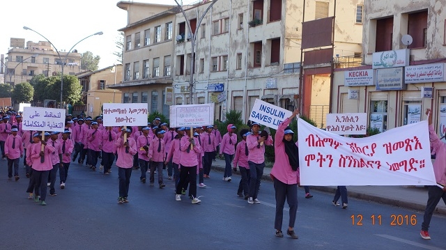 Eritrea observed the World Diabetes Day 2016 at Cinema Roma on the 12 November 2016 in Asmara under the theme “Eyes on Diabetes”. The ceremony began with students parade from Bahtimeske to Cinema Roma with banners and caps featuring key messages of the day.