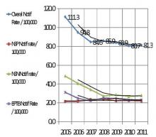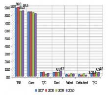 Regarding retreatment cases, the proportion and trend of failure cases showed a marginal but steady rise from 2007 to 2011. MDG Treatment Success Rate (TSR) target for new smear positive TB cases was achieved in 2007 but dropped since 2009 due to rising death and transfer out rates.