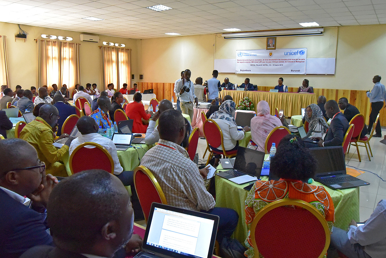 Du 12 au 15 mars 2019, Bujumbura a abrité l’Atelier de monitoring de la vaccination, de revue documentaire des données et de revue par les pairs des rapports conjoints OMS-UNICEF pour les pays de l’Afrique centrale, le Cap Vert, les Comores et Madagascar. Durant les 4 jours de cet atelier, les délégations venues de 10 pays d’Afrique centrale, plus le Cap Vert, les Comores et Madagascar, se sont penchés sur le monitoring des données des rapports conjoints de leurs pays respectifs, pour en améliorer la qualité. Ces rapports seront ensuite transmis par les Gouvernements à leurs partenaires respectifs, qui les utiliseront pour analyser la plupart des soumissions et requêtes qui leurs seront adressées.