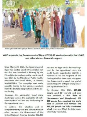 L’OMS apporte un appui au gouvernement du Niger à travers les programmes de vaccination et de surveillance épidémiologique par l’assistance technique et financière. L’OMS coordonne les activités des agences de l’Initiative Mondiale d’Eradication de la Poliomyélite (IMEP) pour des engagements cruciaux et des opérations respectant les différences hommes-femmes, le contrôle de la qualité des vaccins au point de prestation, la gestion des données statistiques et le plaidoyer pour la mobilisation des ressources. L’OMS a également soutenu l’élaboration du plan de transition dont la mise en œuvre est en cours pour que les acquis et infrastructures de l’IMEP continuent d’être mis à contribution dans d’autres domaines de la santé, notamment le renforcement de la surveillance des maladies et la gestion des épidémies, le renforcement de la vaccination et du système de santé en général. A titre d’exemple, le système de surveillance de la poliomyélite est progressivement utilisé pour la surveillance des autres maladies, le renforcement de la vaccination de routine et du système de santé. Surtout depuis 2020, les relais communautaires utilisent l'infrastructure de la poliomyélite pour la surveillance de la COVID-19.